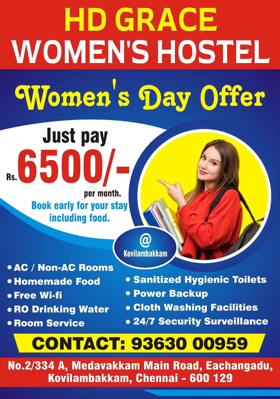 HD Grace Women's Hostel is a premier women's hostel located in the peaceful neighbourhood of Kovilambakkam, Chennai. We provide safe, comfortable, and affordable accommodation for working women and students.